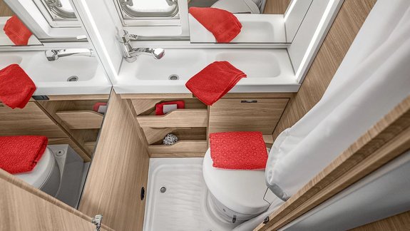 Das Bad ist durchdacht bis in den letzten Winkel. Es gibt geräumige Ablagefächer und eine maximale Beinfreiheit im Toilettenbereich.