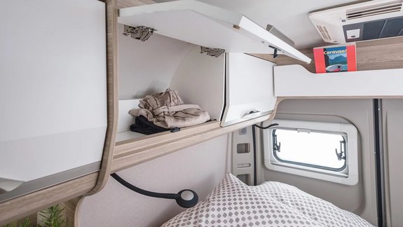 Über dem Bett finden Sie praktischen Stauraum, für Kleidung, Bücher und Kleinkram.
