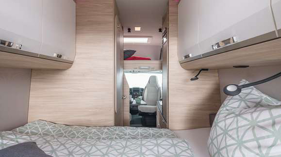 Das große Querbett bietet einen bequemen Schlafplatz. Zudem ist es möglich, durch das Öffnen der Hecktüren eine einmalige Aussicht zu genießen.