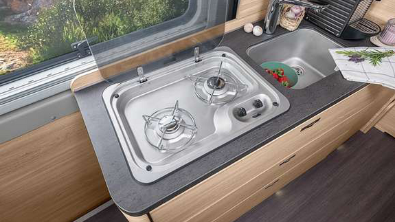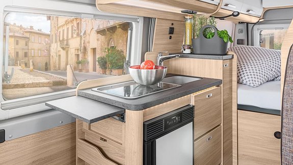 Der 75 l Camper Van-Kompressorkühlschrank wird optimal in den Küchenblock integriert.