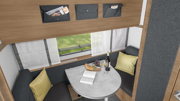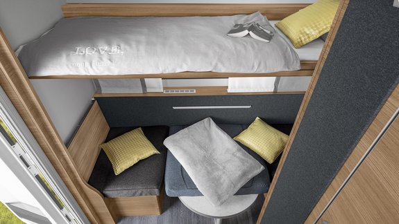 Ciao Dinette, hallo Gast! Im 400 LK sind mit wenigen Handgriffen 2 Zusatzbetten verfügbar. Statten Sie das Kinderbett mit optionalen Ausgleichskissen aus, die passgenau in die darunter liegende Dinette passen. Fertig!