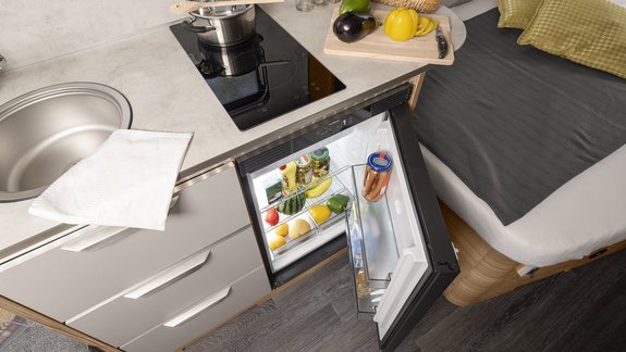 Im E.POWER SELECTION erwarten Sie eine leicht zu reinigende, kindersichere Induktions-Doppelkochplatte und ein effizienter Kompressor-Kühlschrank.