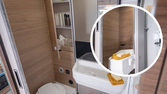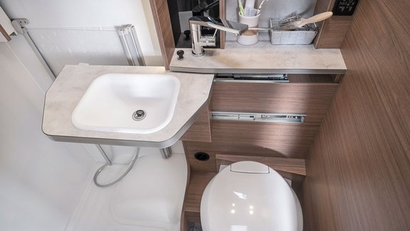 Durch das Verschieben des Waschtisches können Sie die Toilette jederzeit nutzen, selbst wenn die Dusche gleichzeitig ausgeklappt ist.