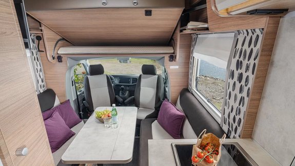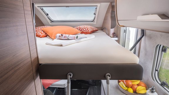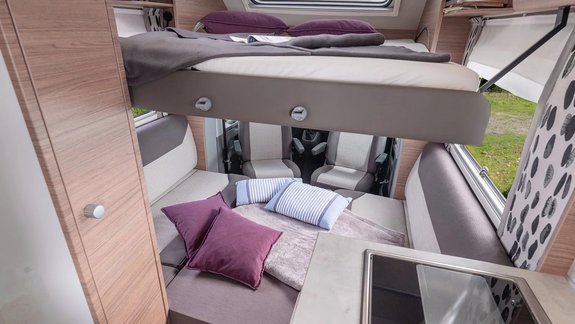 Durch eine innovative Bett-Lösung können Sie sowohl die Sitzgruppe zu einem großzügigen Doppelbett umbauen, als auch das Slide-Bett herunterlassen. So entstehen 4 vollwertige Schlafplätze.