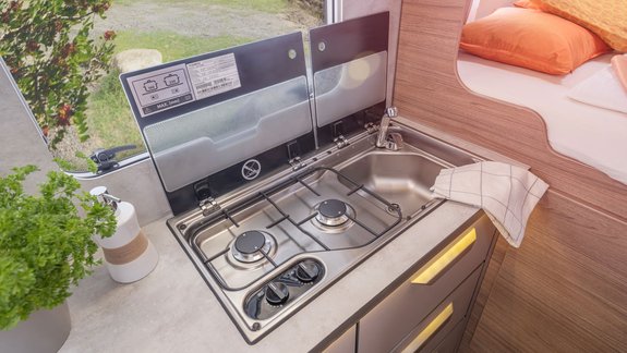 Die Küche ist ein kompaktes Raumwunder! Der gut organisierte Küchenblock enthält einen Kompressorkühlschrank, einen 2-flammigen Gaskocher, eine Spüle und jede Menge Stauraum.