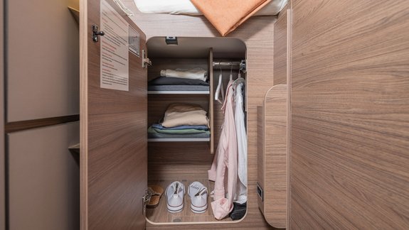 Unter dem Heckquerbett finden Sie einen kompakten Kleiderschrank mit vielen Ablagen, einem Schuhfach sowie einer praktischen Kleiderstange.